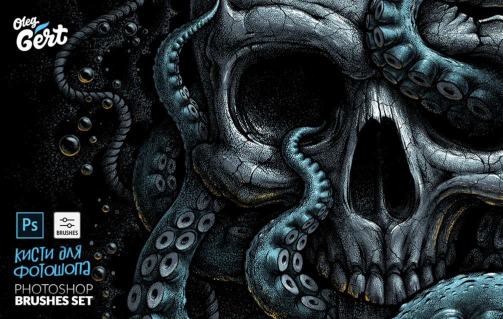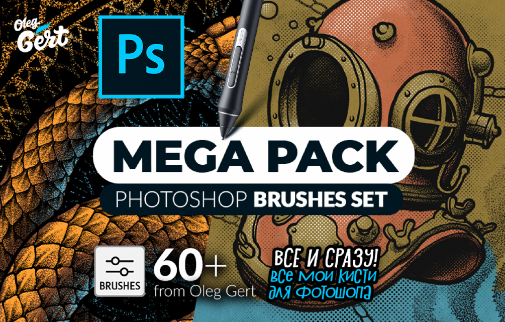 А также более 20 кистей для создания дотворк, шумных, крафтовых текстур и линий от коммерческого иллюстратора Олега Герта.