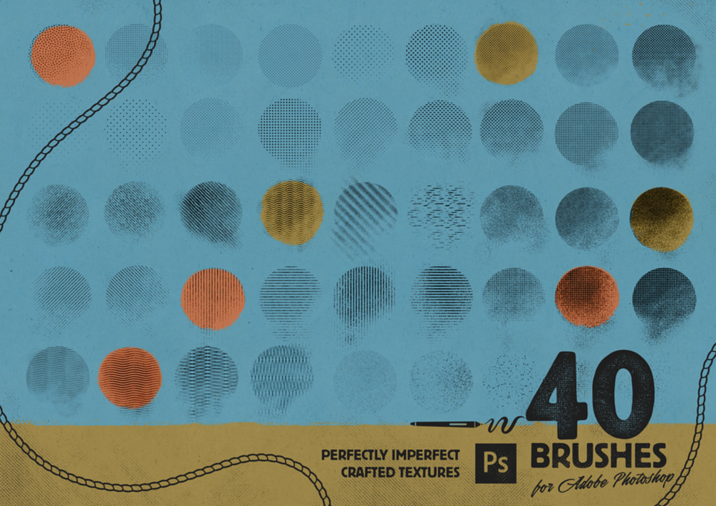Более 40 кистей - универсальные бесшовные полутоновые кисти (Half tone) они дают невероятный уровень теневых тонов и делают иллюстрацию похожей на старинную технику печати.