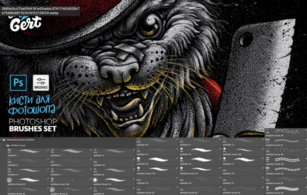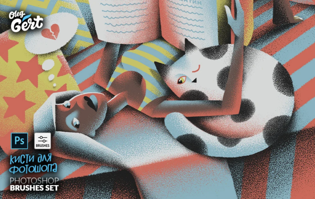 А также более 20 кистей для создания дотворк, шумных, крафтовых текстур и линий от коммерческого иллюстратора Олега Герта.