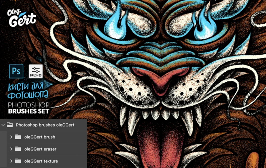 And also more than 20 brushes for creating dotwork, noisy, craft textures and lines from commercial illustrator Oleg Gert.